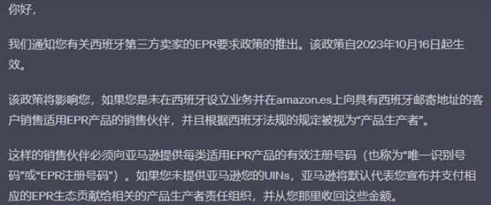 相信最近很多的亚马逊等电商卖家都接到了平台通知,要求在2024年1月1日之前提供西班牙EPR,如果不能提供,可能面临产品下架风险。
